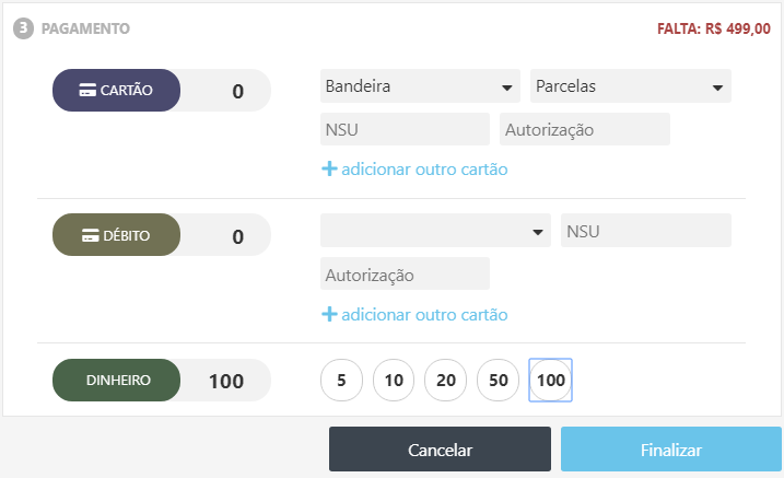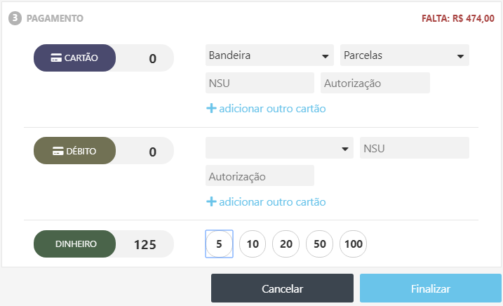 Outra informação sobre este recurso é que o sistema soma os valores de acordo com os botões que o cliente clica. Não importa o montante que o cliente entregue ao caixa, qualquer valor poderá ser registrado com estes botões. Observe novamente no exemplo que selecionamos também os botões 20 e 5, alterando o valor em dinheiro entregue pelo cliente. Perceba que os valores foram atualizados, tanto no topo da imagem quanto no campo da forma de pagamento em dinheiro.
