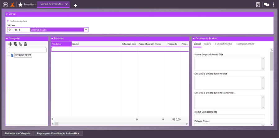 No exemplo abaixo, a vitrine teste ainda não foi "abastecida" com produtos.