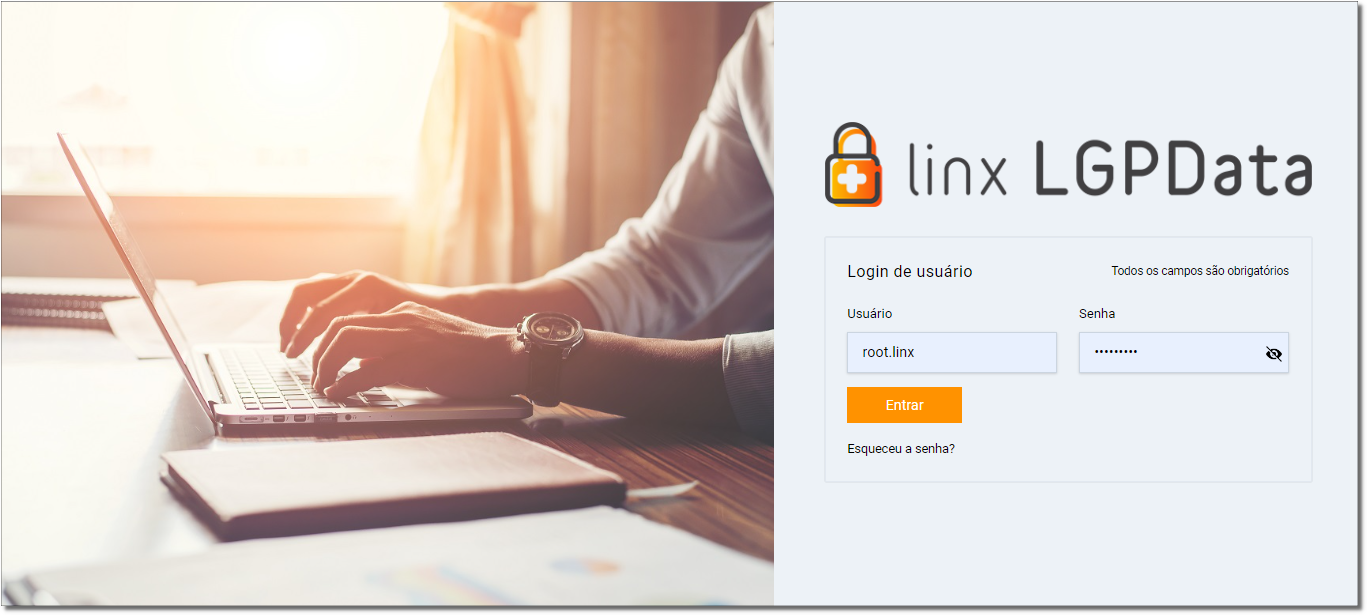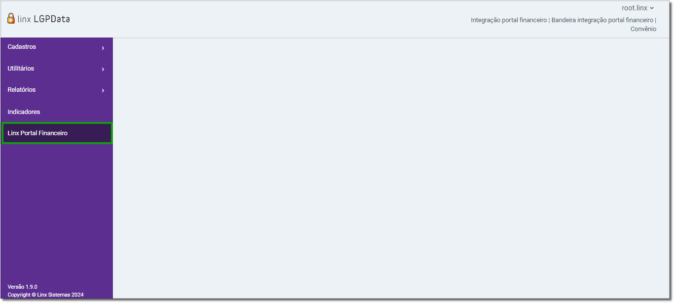 1. Para acessar o Portal Financeiro pelo Backo Office, acesse: Portal LGPData com o Usuário ROOT e a Senha e