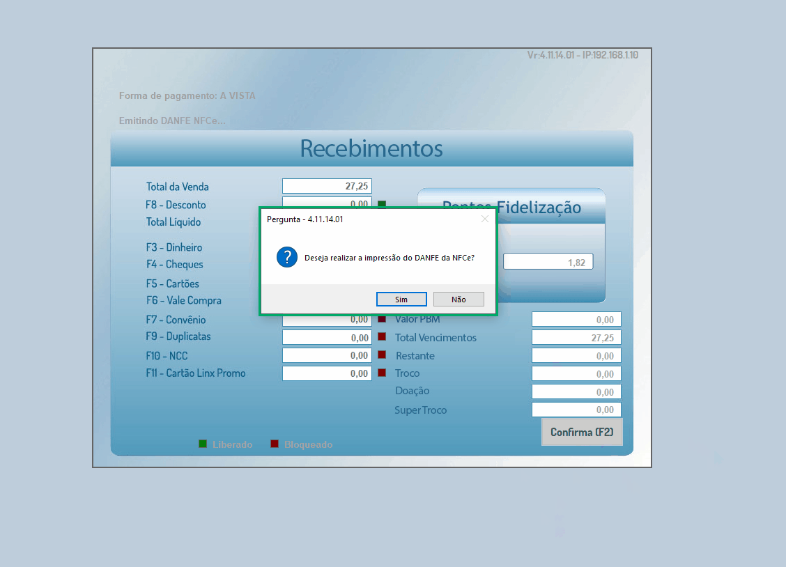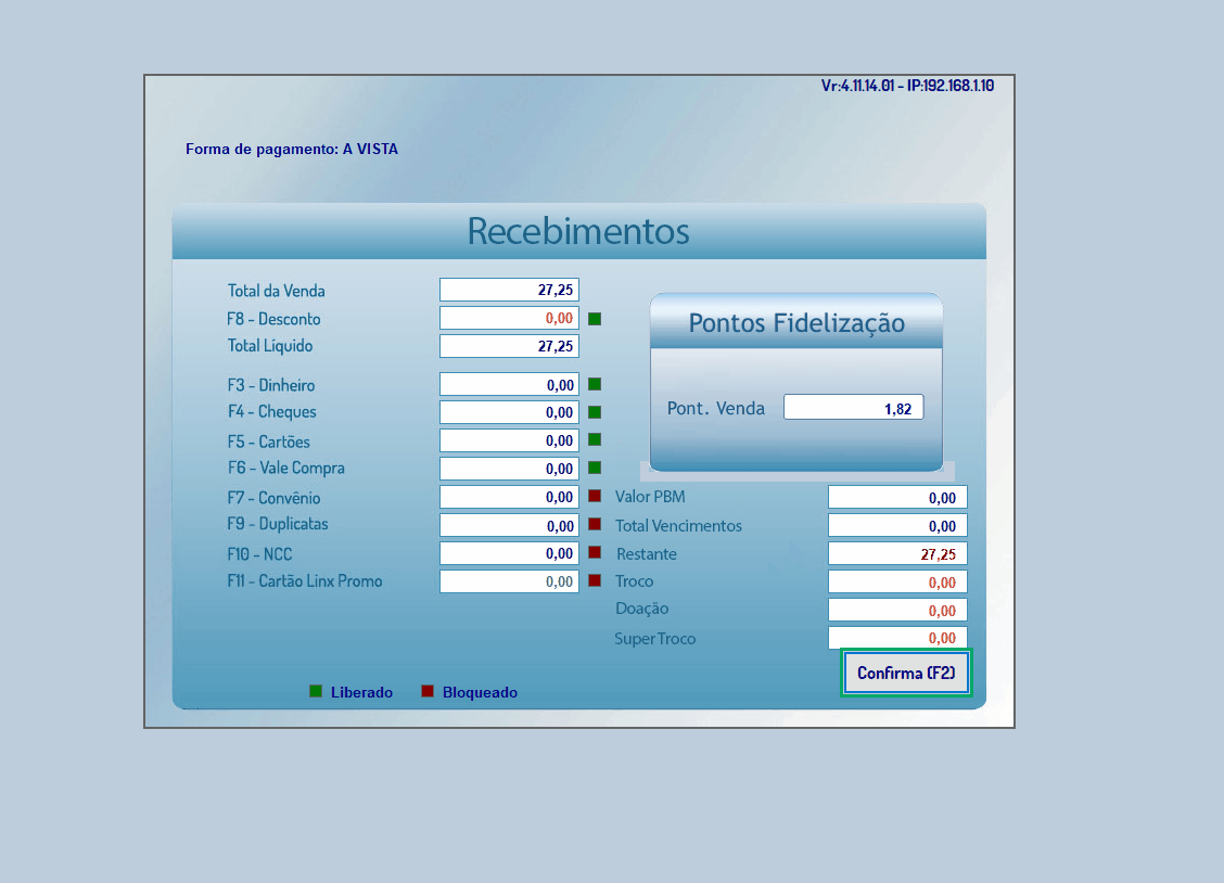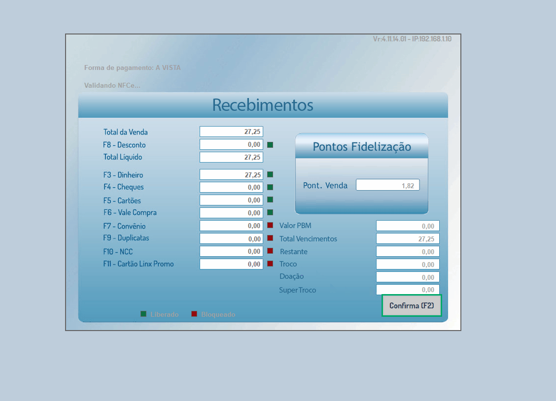 9. Irá abrir a tela de Recebimentos, clique em Confirmar ou pressione F2.