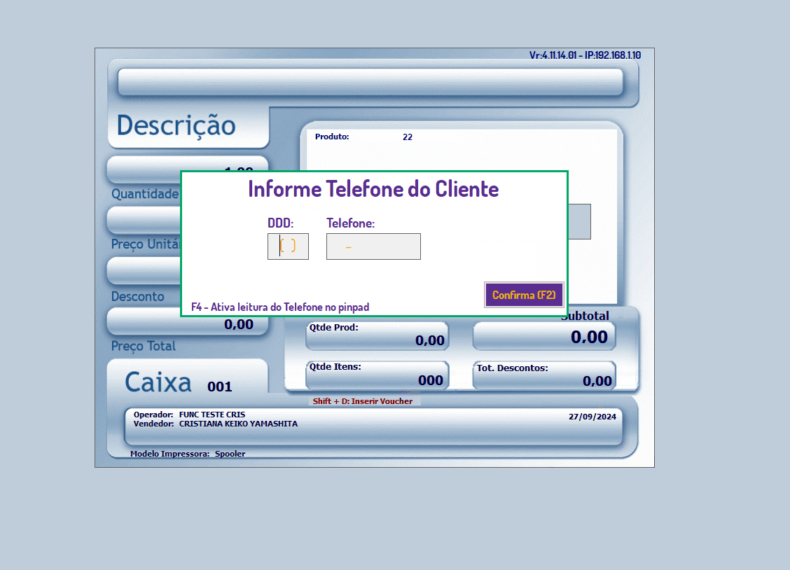 6. Informe o telefone do cliente e clique em Confirmar ou pressione a tecla F2.
