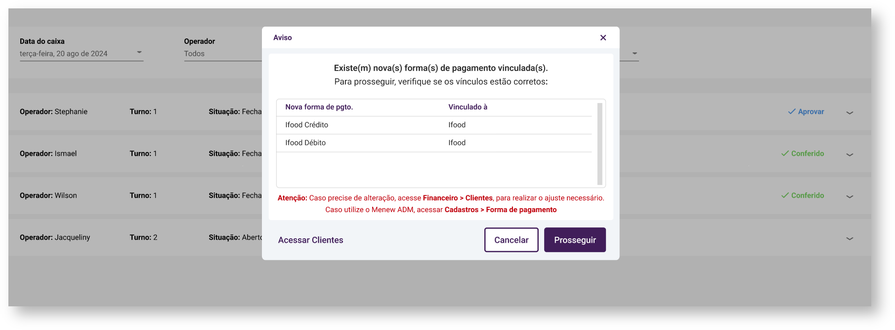 Na prática: se uma nova forma “IFOOD CRÉDITO” integrar em um pedido, e ela for vinculada equivocamente à “VISA CRÉDITO” pelo operador de Caixa, essa forma será enviada ao Portal, notificando o responsável por conferir o caixa.