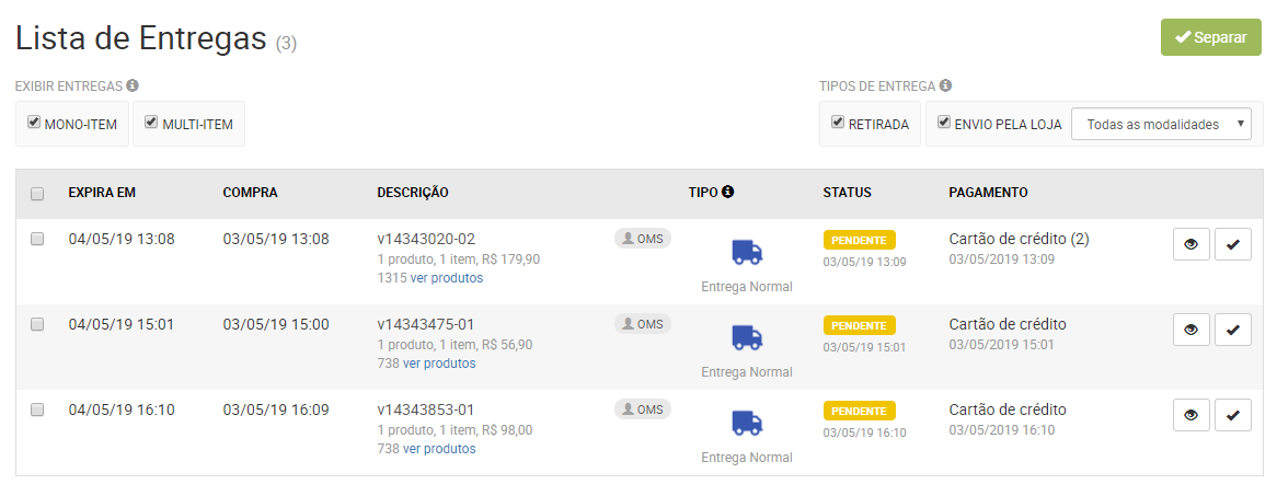 - MULTI-ITEM - Marque essa opção para exibir entregas que tenham mais de um produto (SKU).