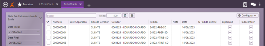 - As colunas de CFOP e Observação, são preenchidas a partir de cadastros preenchidos previamente no e-Millennium.