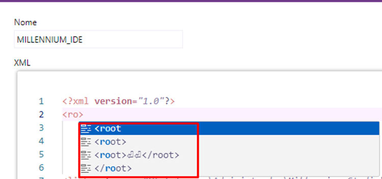 Ao digitar no campo XML, o autocomplete irá auxiliar para completar suas tags