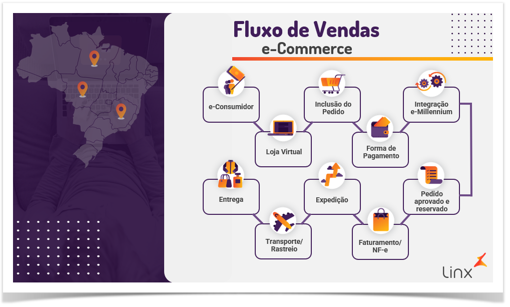 Já o ERP é o sistema que gerencia e controla a retaguarda da loja, incluindo a manutenção do catálogo de produtos, a emissão da nota fiscal eletrônica e a baixa de estoque.