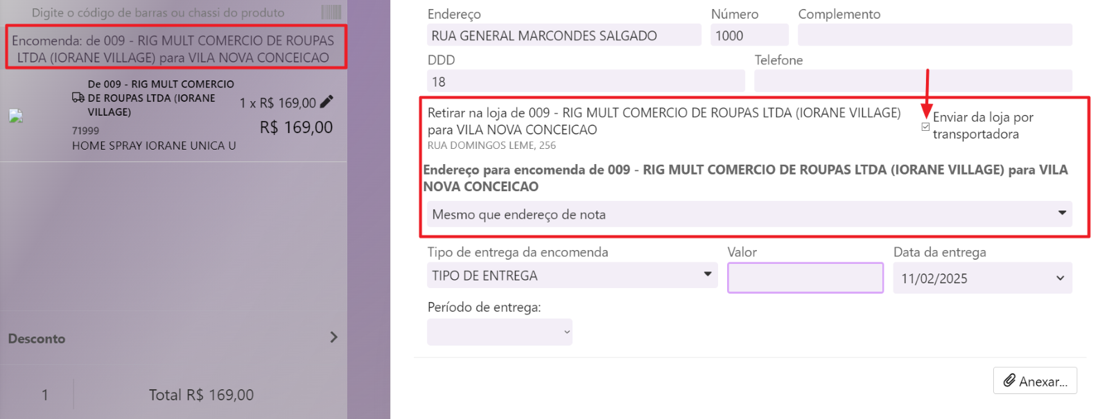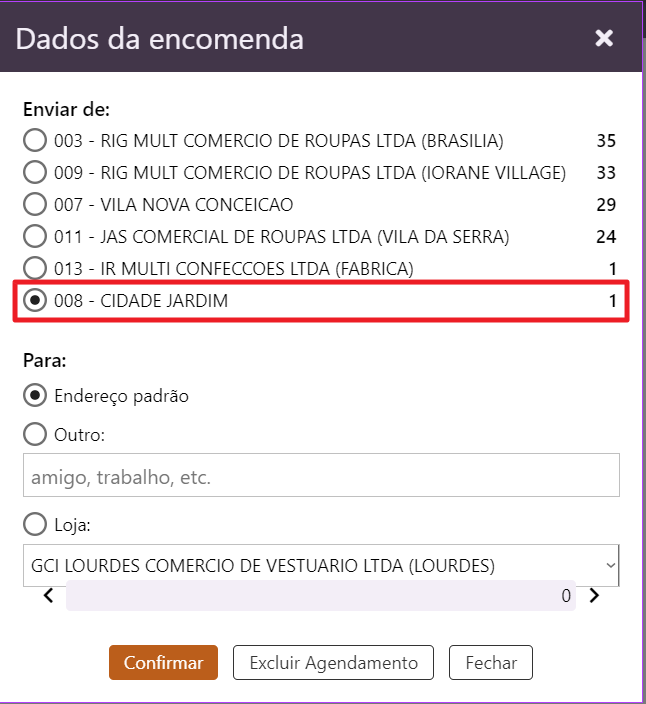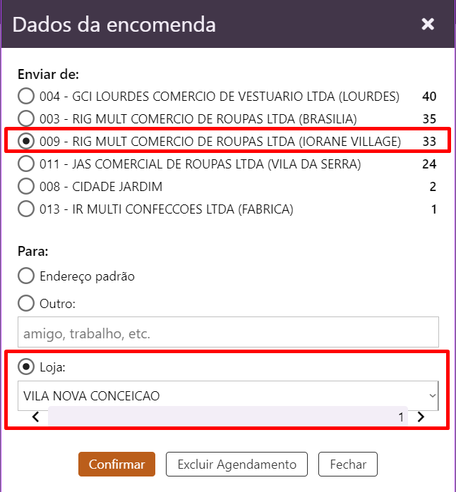 Veja que o sistema informa as filiais que estão vinculadas na operação e que deve-se marcar a opção “Enviar da Loja por Transportadora”