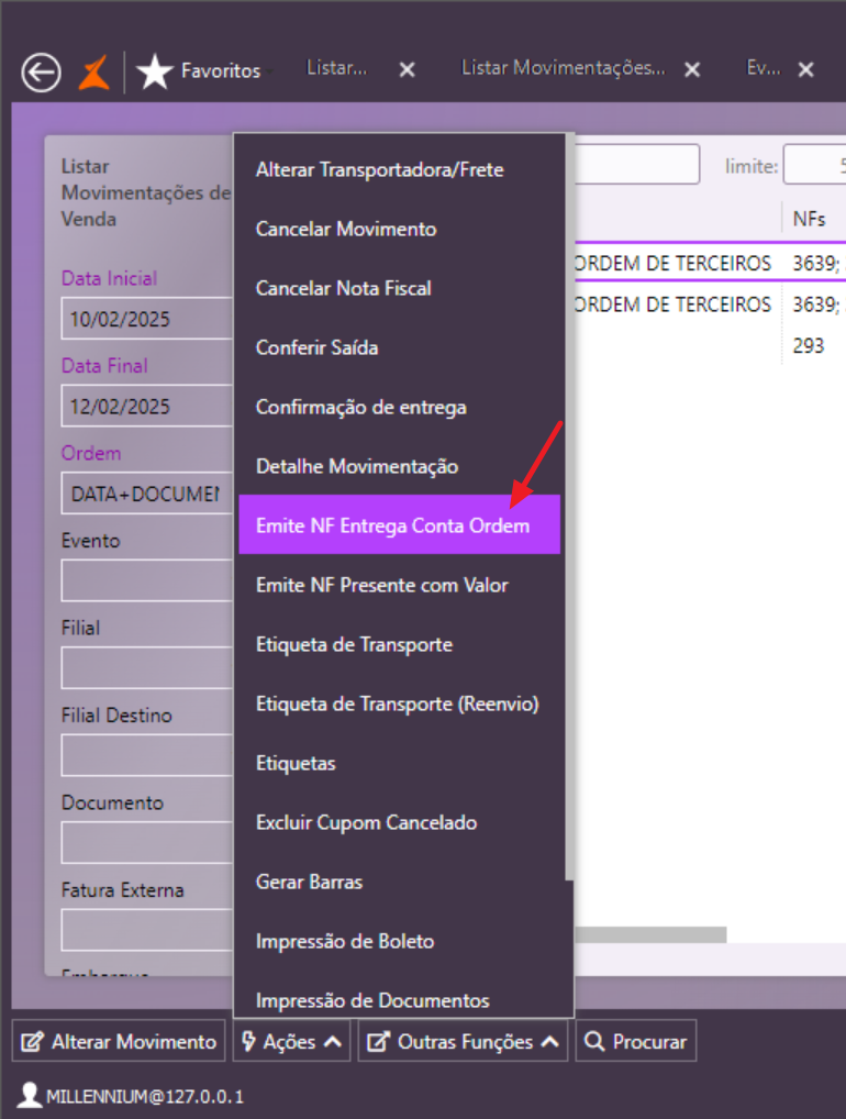 Caso exista algum problema na emissão da Nf de Conta e ordem, existe um botão para você reenviar a NF em Consulta Movimentações: