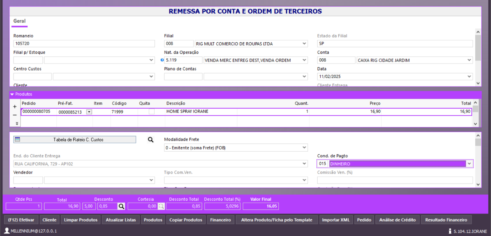Pela filial 008 que foi encomendada, será realizado faturamento da remessa (6.923) e venda (6.119) para outra filial por conta e ordem. De forma automática, será ativado o pedido Omni, faturando a venda (5.102).