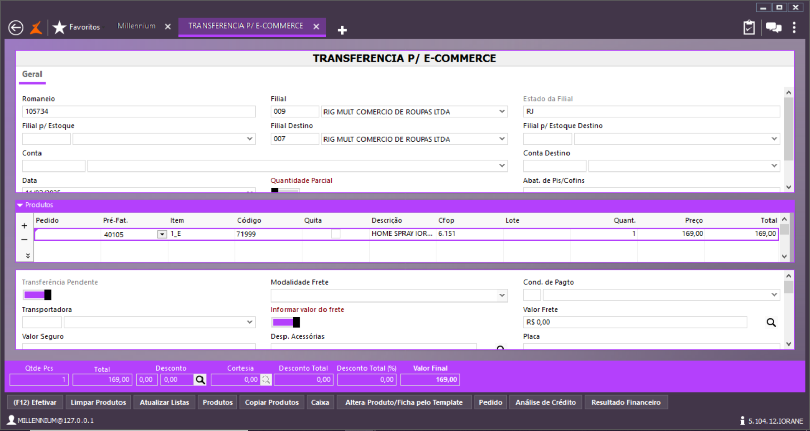 Aperte em Faturar e o evento de transferência será aberto, finalize a transferência. Para a filial 009 o processo é finalizado.