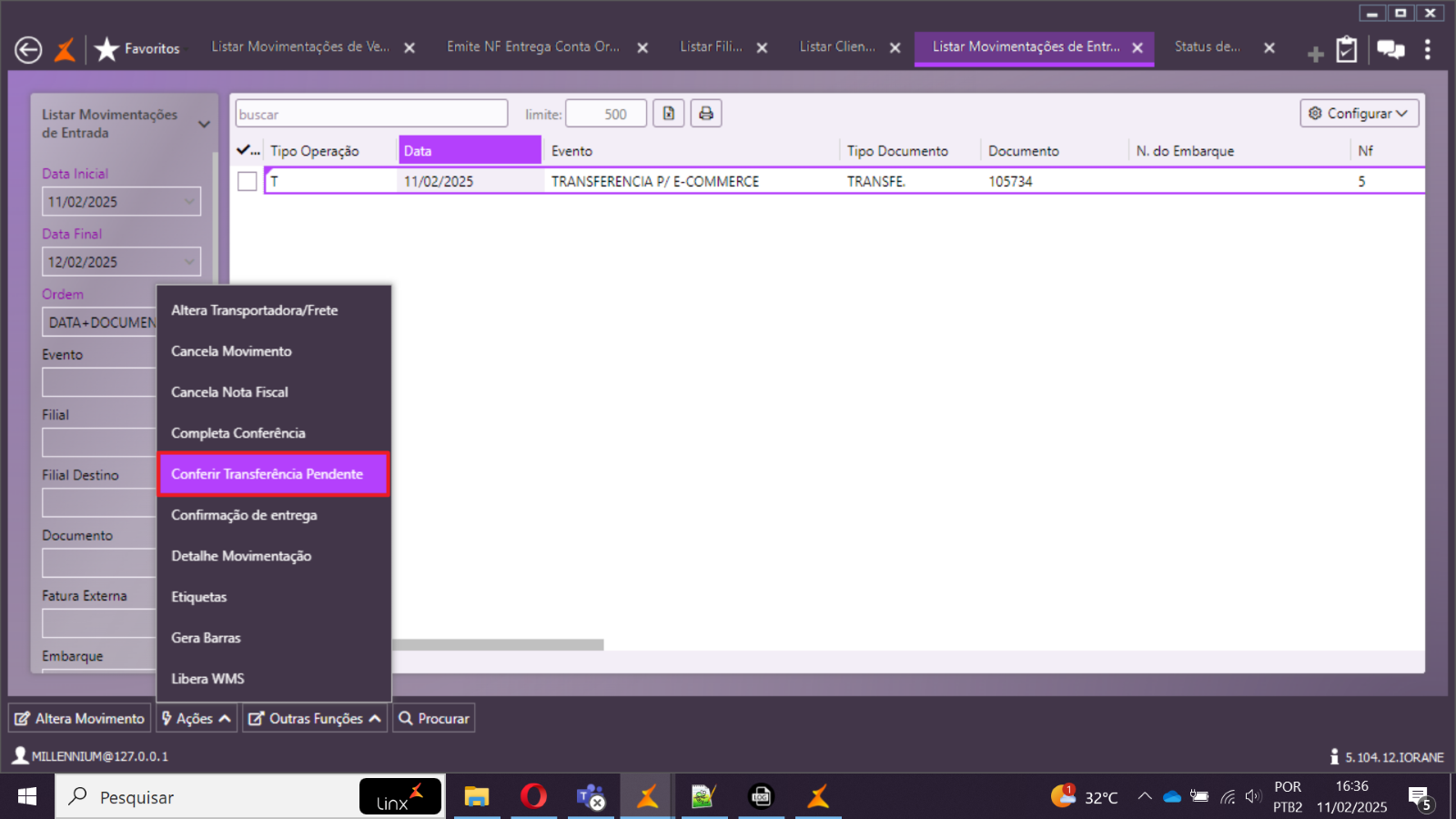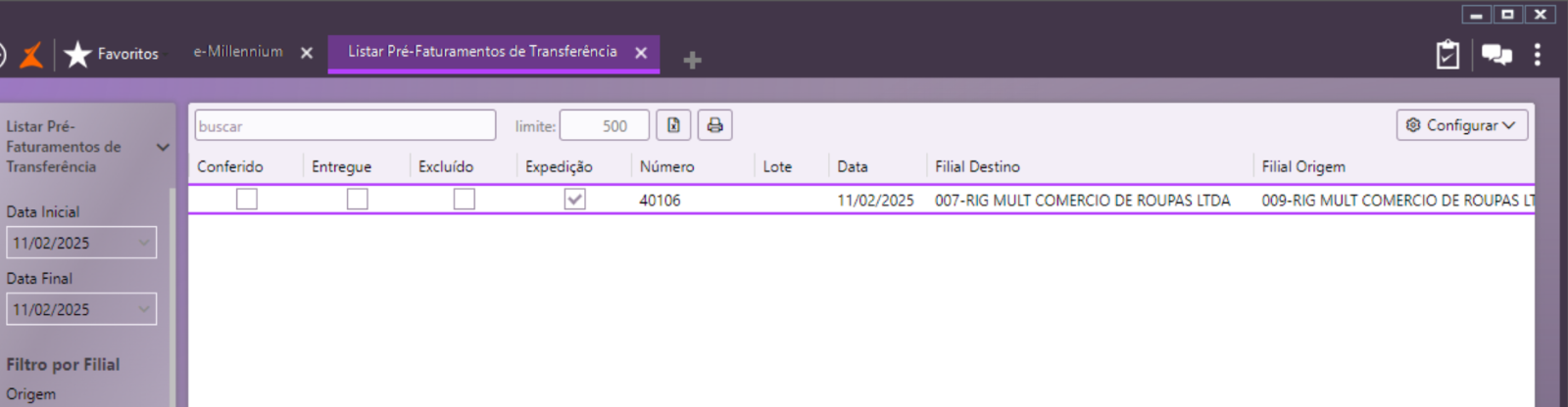 Utilizando o retaguarda com a Licença Padrão, deve-se conferir o pré-faturamento de transferência e depois faturá-lo em evento de transferência de forma manual.