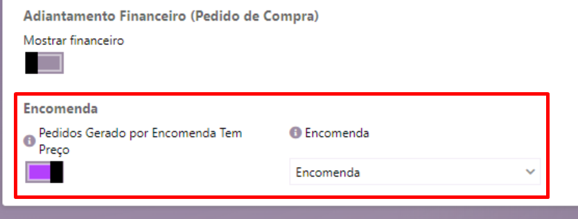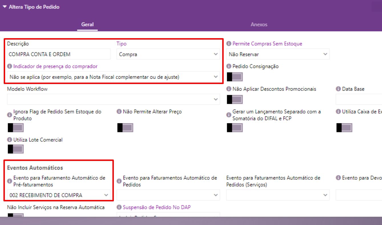 Venda -> Pode ser utilizado o tipo de pedido da venda padrão, porém com a configuração de Requisição de Compra e Encomenda definidos