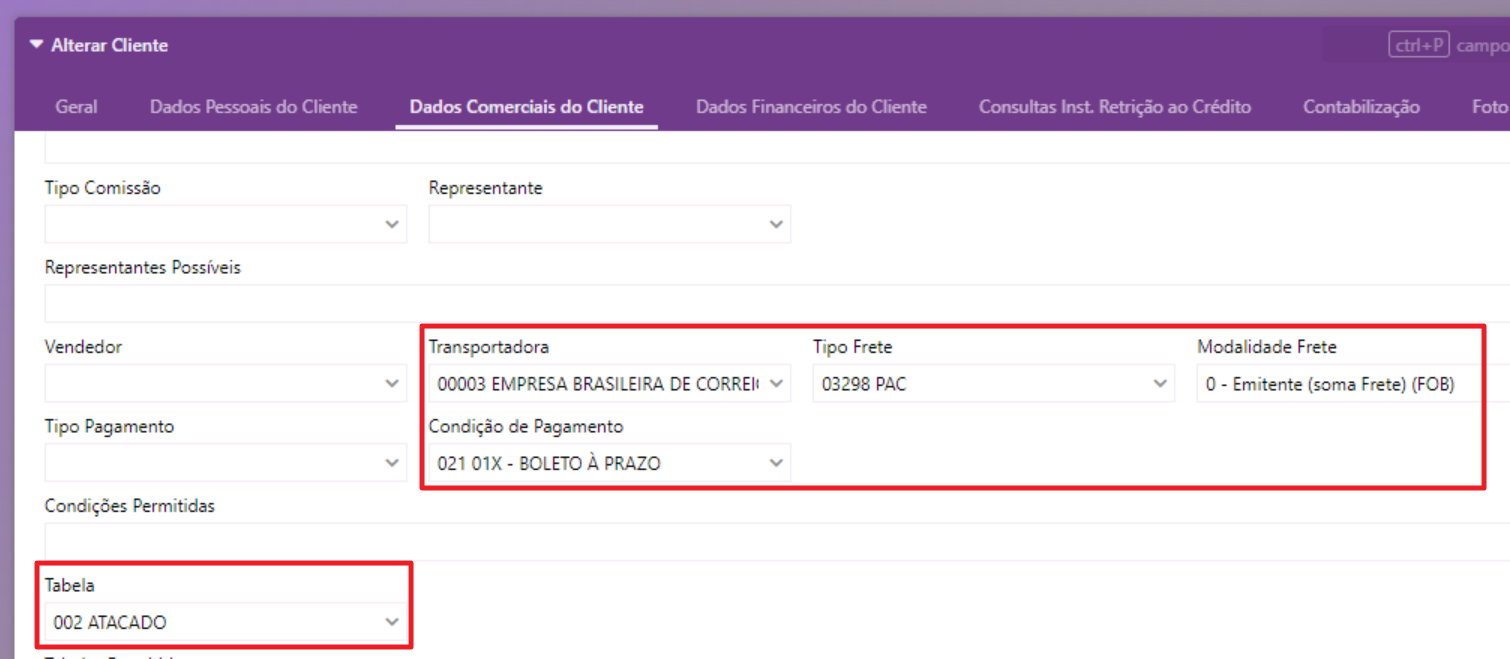 Financeiro -> Receber -> Cadastros -> Clientes -> aba Dados Comerciais do Cliente