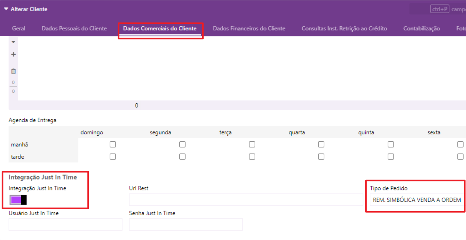 Na mesma aba, marcar Integração Just In Time marcada e Tipo de Pedido de Remessa