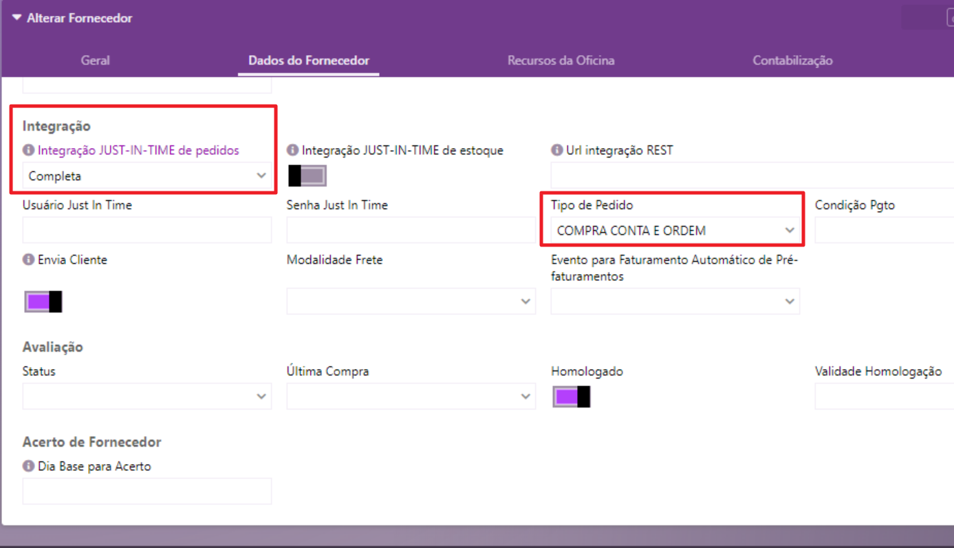 Marcar Integração JUST-IN-TIME de pedidos: Completa e definir o Tipo de Pedido de Compra