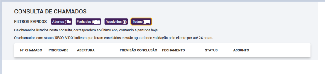 Além disso, ao selecionar os botões azuis correspondentes aos status, o sistema filtrará e exibirá apenas os chamados que se enquadram no status selecionado, facilitando a visualização e o acompanhamento dos atendimentos.