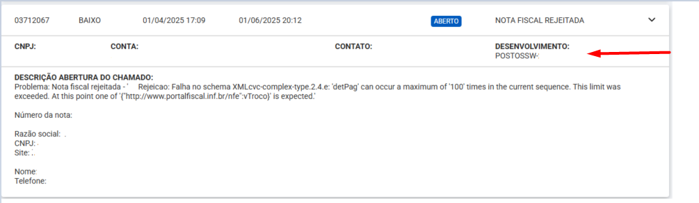 Quando a descrição indicar "Desenvolvimento" seguida da nomenclatura "POSTOSSW-xxxx", isso significa que o chamado está sendo tratado pela equipe de engenharia.