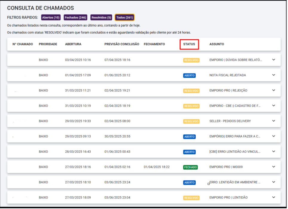 Abaixo será apresentado a lista de chamados disponíveis para consulta