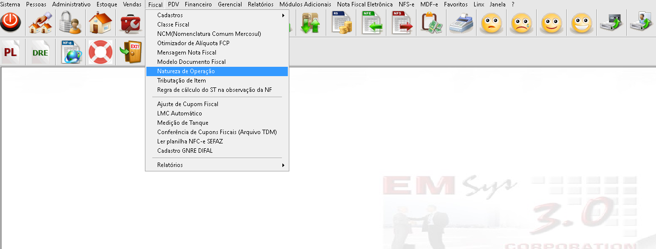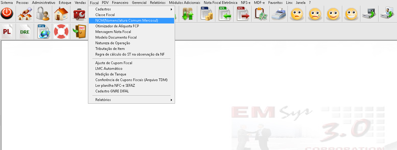 Para cadastro do NCM vá ao menu fiscal no EMSys NCM.