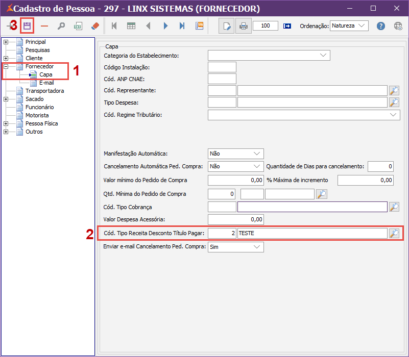 1. Localize o cadastro do fornecedor a ser configurado, clique na guia Fornecedor Capa.