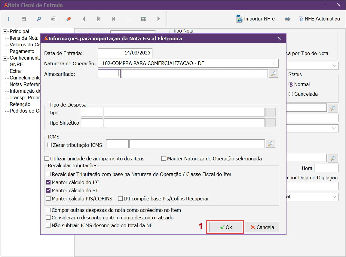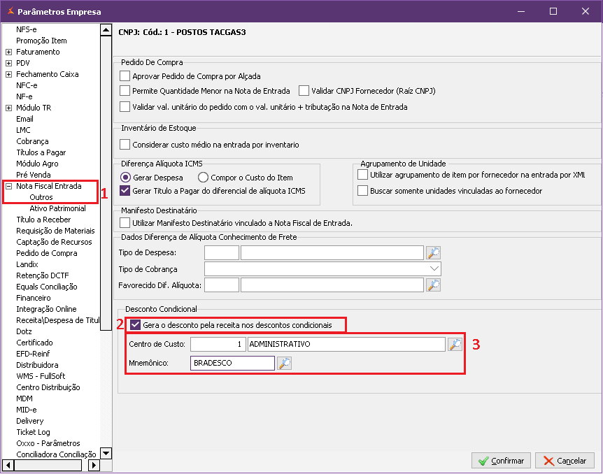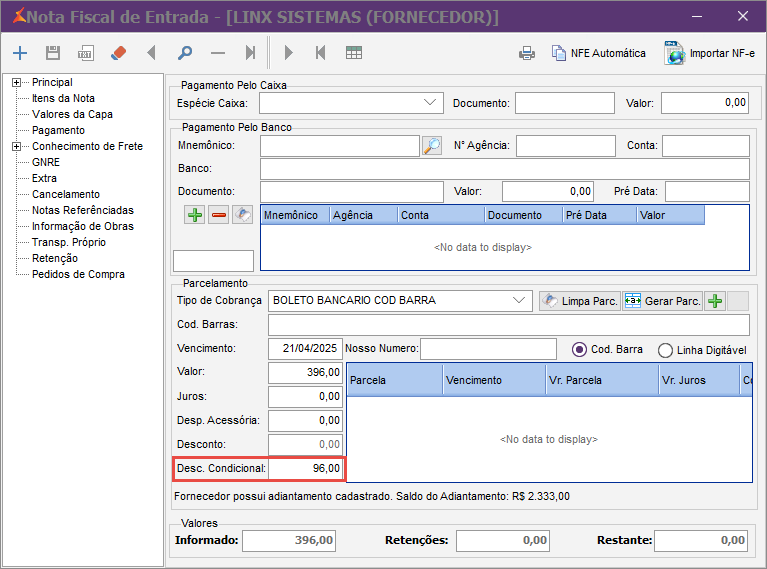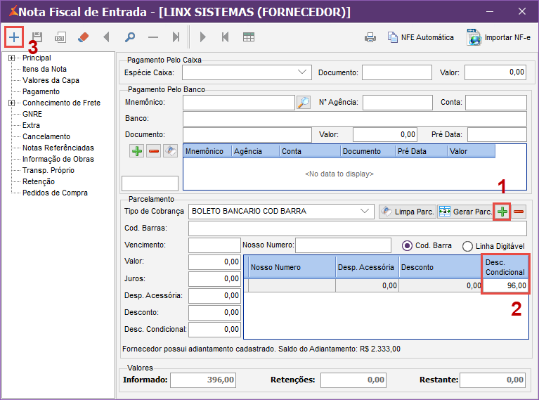1. Na guia Nota Fiscal de Entrada → Outros, marque o flag Desconto Adicional.