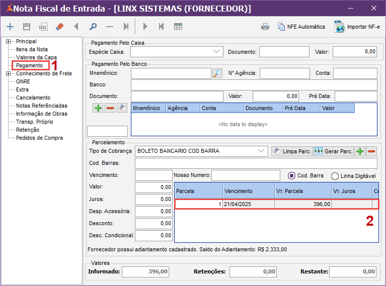 4. Após o carregamento das informações do XML, acesse a guia Pagamento e localize o parcelamento.