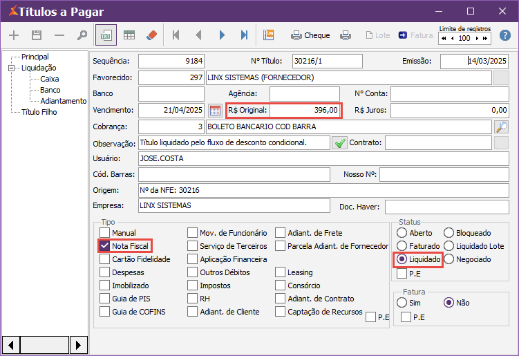 2. Pesquise o título para verificar que o desconto condicional não será abatido do valor original, mas sim refletido como uma liquidação parcial. O status do título aparecerá como liquidado.