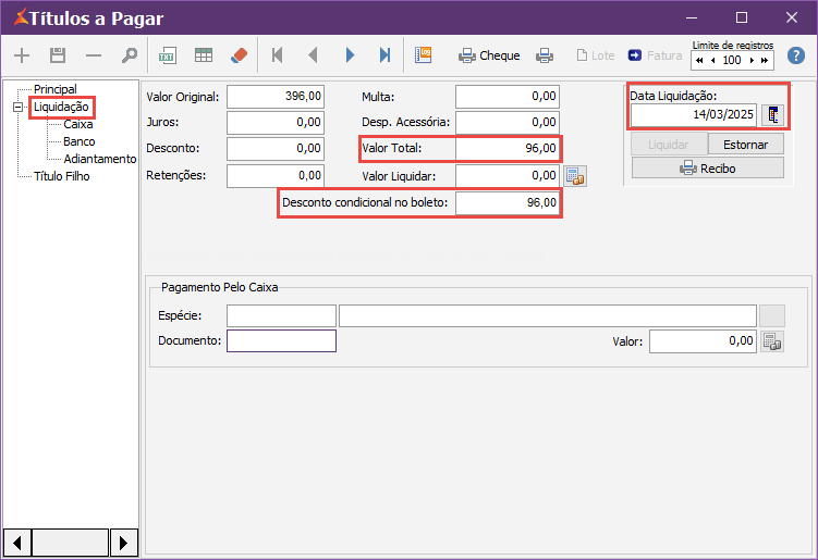 3. Clique na guia Liquidação para visualizar o valor do desconto condicional e a data da liquidação.