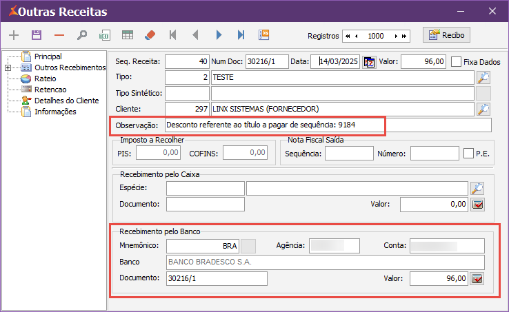 1. Acesse Administrativo → Receitas → Outras Receitas e localize a receita gerada. Verifique a origem e o banco da receita gerada a partir do desconto condicional.
