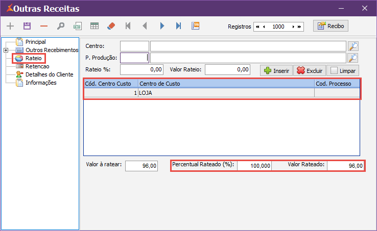 2. Na guia Rateio, você poderá ver o Centro de Custo e o valor do rateio.