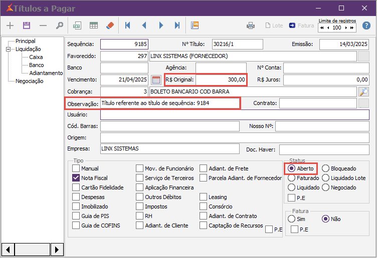 4. Um novo título será gerado no valor do saldo do título original, mas em aberto, com vencimento conforme informado na nota de entrada.