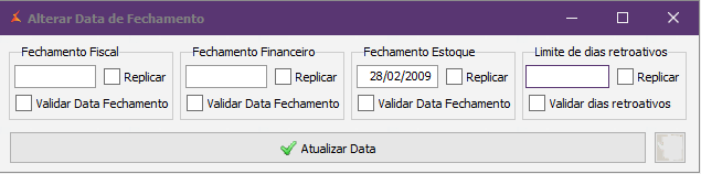 Nesta tela é possível determinar os dias de fechamento, bloqueando a movimentação dentro do sistema quando ultrapassar a data limite informada.