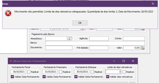Quando for realizado alguma movimentação que ultrapasse a data informada, o sistema irá retornar com a seguinte mensagem.