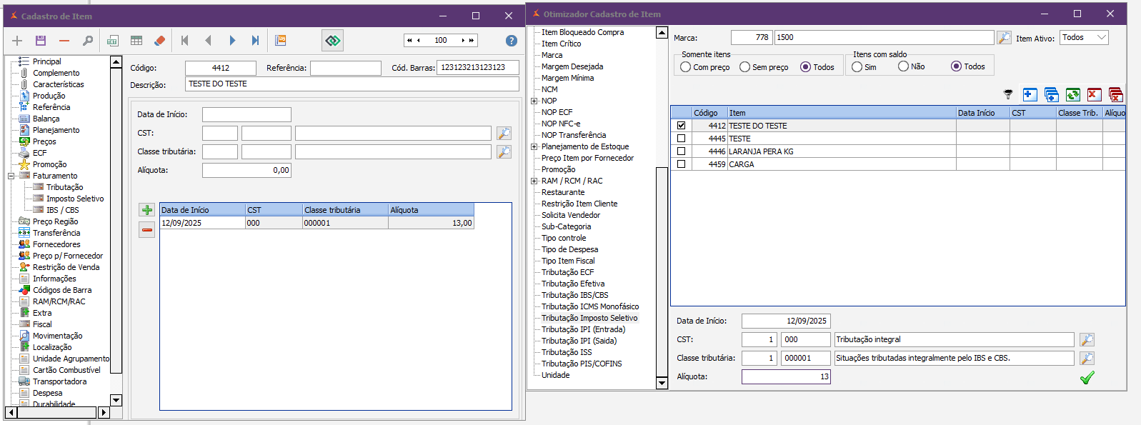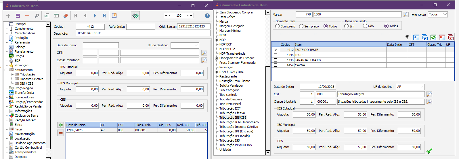 Otimizador de Cadastro de Itens agora conta com novas abas para facilitar o preenchimento em massa das informações de impostos IBS, CBS e IS.