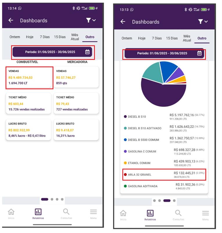 - Separação clara por tipo de item: Itens do tipo combustível são exibidos no Dashboard de Combustíveis, enquanto itens como Arla (não sendo combustível) aparecem no Dashboard de Produtos.