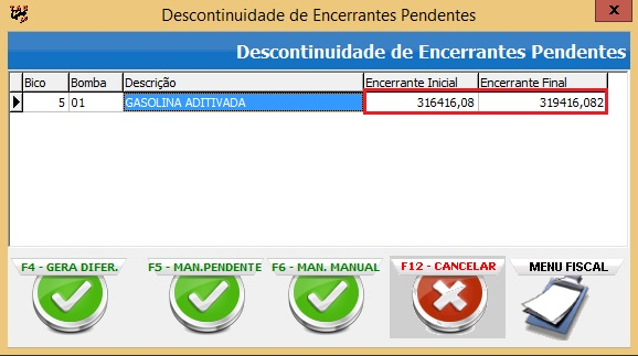 Como mostra na imagem, o encerrante do último abastecimento registrou um valor de 316416,08 e aconteceu um novo abastecimento, onde o encerrante marcou 319416,082, por tanto fazendo a subtração dos dois encerrantes, temos 319416,082 – 316416,08 = 3000,02, uma diferença de mais de 2000 litros. Essa diferença caracteriza para o sistema que aconteceu uma descontinuidade e precisa ser resolvida, pois o bico ficará bloqueado até que a descontinuidade seja tratada.