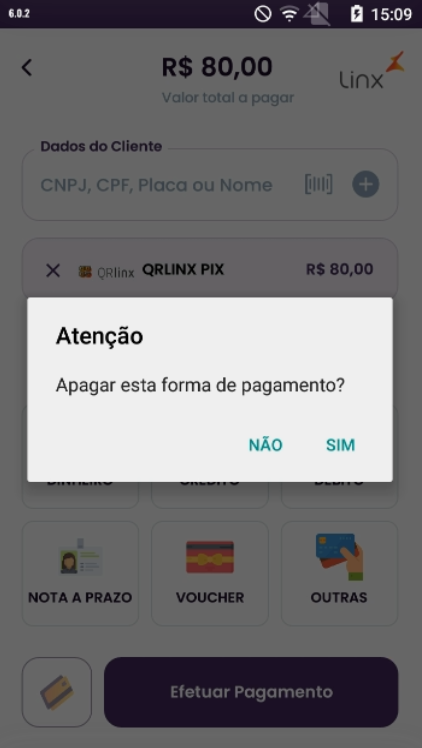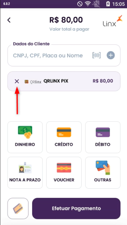 Para realizar um cancelamento de venda com a forma de pagamento QR Linx, basta pressionar o x na forma de pagamento QRLINX PIX.