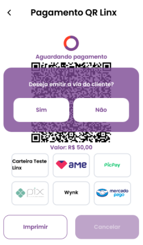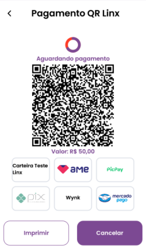 Quando integrado com o QR Linx, o Smart POS pode oferecer mais uma opção de forma de pagamento: QR Linx. Quando selecionada, o cliente terá opção de efetuar seu pagamento através da leitura de um QR Code gerado na tela do Smart POS, por meio de um aplicativo de pagamento digital (Exemplo: Linx Pay, PIX, AME, Mercado Pago, PicPay) instalado em seu Smartphone.