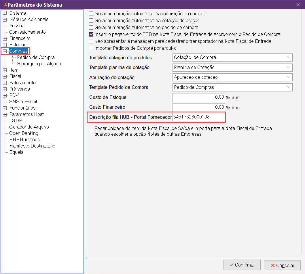 • Informar o CPNJ base na fila de processamento do hub, em Parâmetros Sistema → Compras → Descrição fila Hub – Portal Fornecedor.