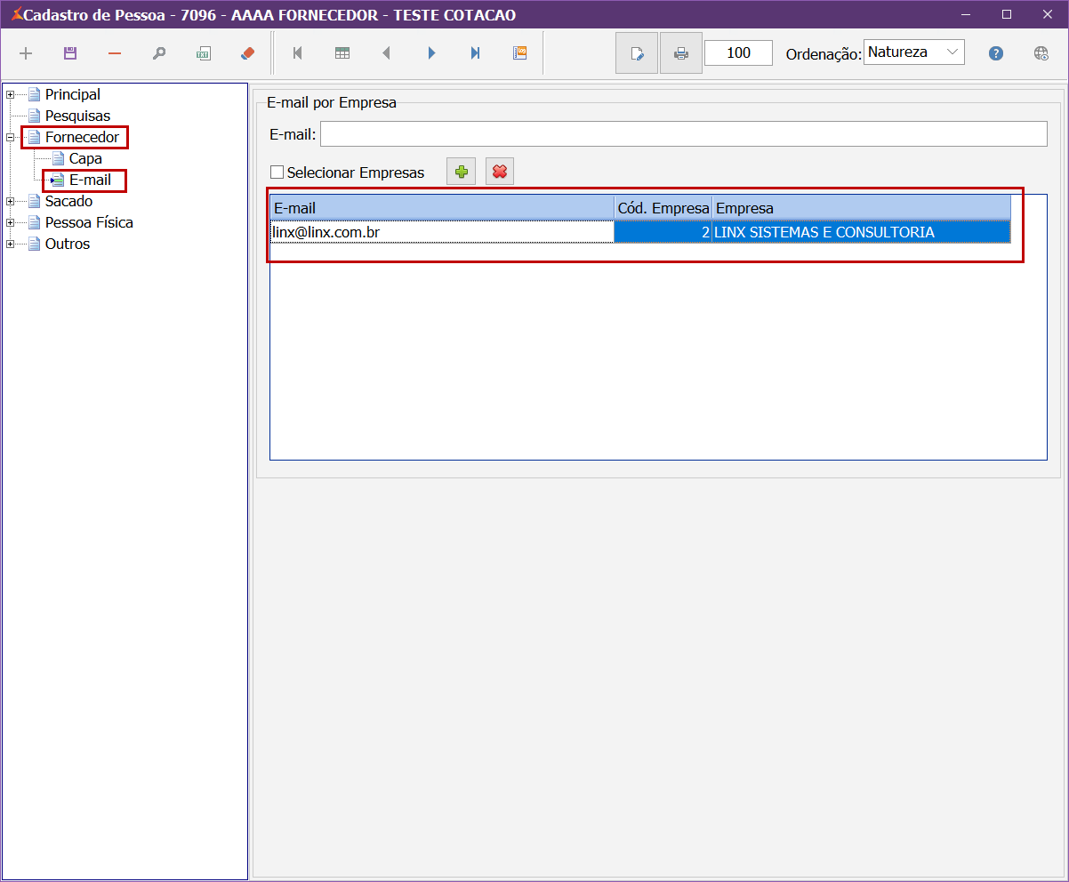 • Para o disparo automático do link para o fornecedor, é necessário informar o e-mail do fornecedor cadastrado em Pessoas → Pessoa → Pessoas → Fornecedor → E-mail.