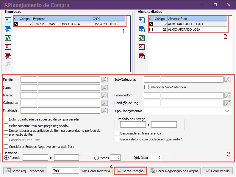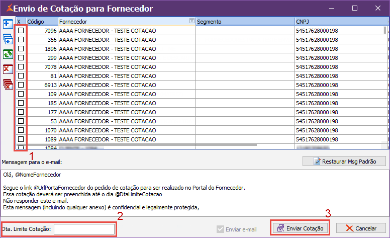 • Na tela Envio de Cotação para Fornecedor, siga os passos abaixo: