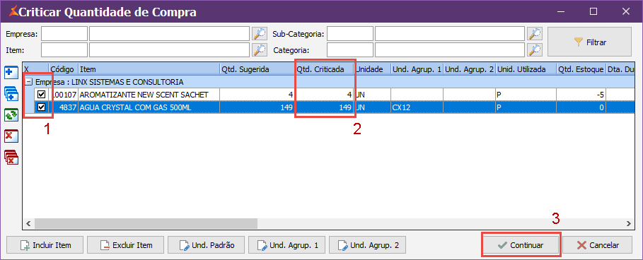 2. Informe a quantidade no campo “Qtd. Criticada”: Para cada produto, insira a quantidade de unidades, quilos ou peças que será cotada, conforme a necessidade da compra.