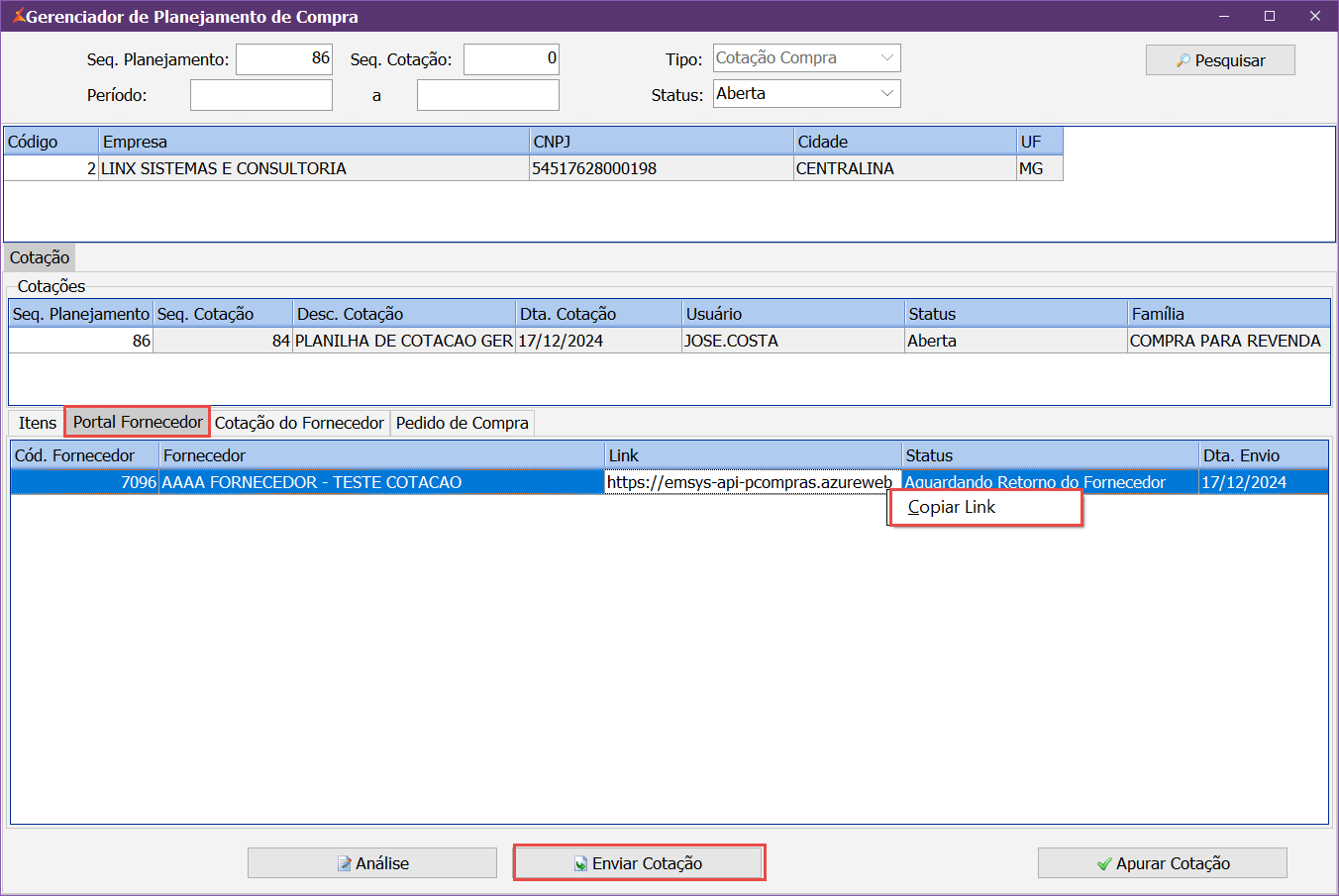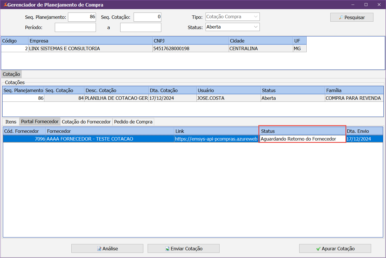 • Retornando ao EMSys, ao acessar o Gerenciador de Planejamento de Compra, será possível verificar o status atualizado da cotação, que indicará "Fornecedor Retornou Cotação" quando o fornecedor já tiver enviado sua proposta.