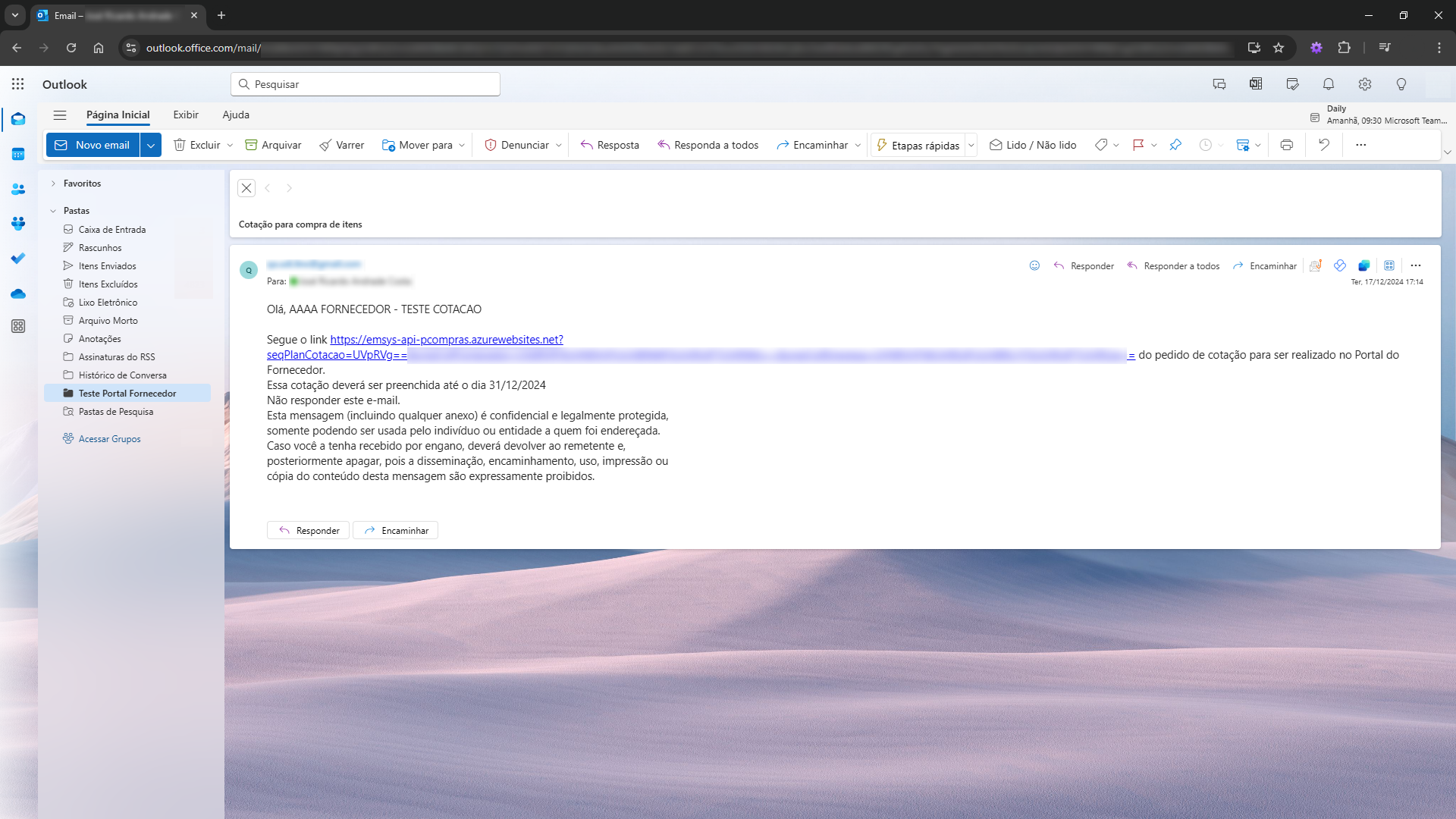 • O fornecedor receberá em sua caixa de entrada um e-mail contendo um link, conforme o exemplo abaixo. Ao clicar nesse link, o fornecedor será redirecionado para o Portal Fornecedor, onde poderá preencher todas as informações necessárias para a cotação, como preços, prazos de entrega e condições de pagamento.