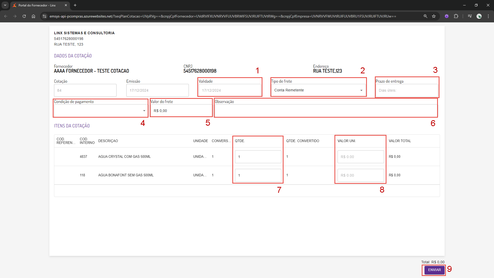 • Ao acessar o link enviado, o fornecedor visualizará a cotação e precisará preencher as seguintes informações: