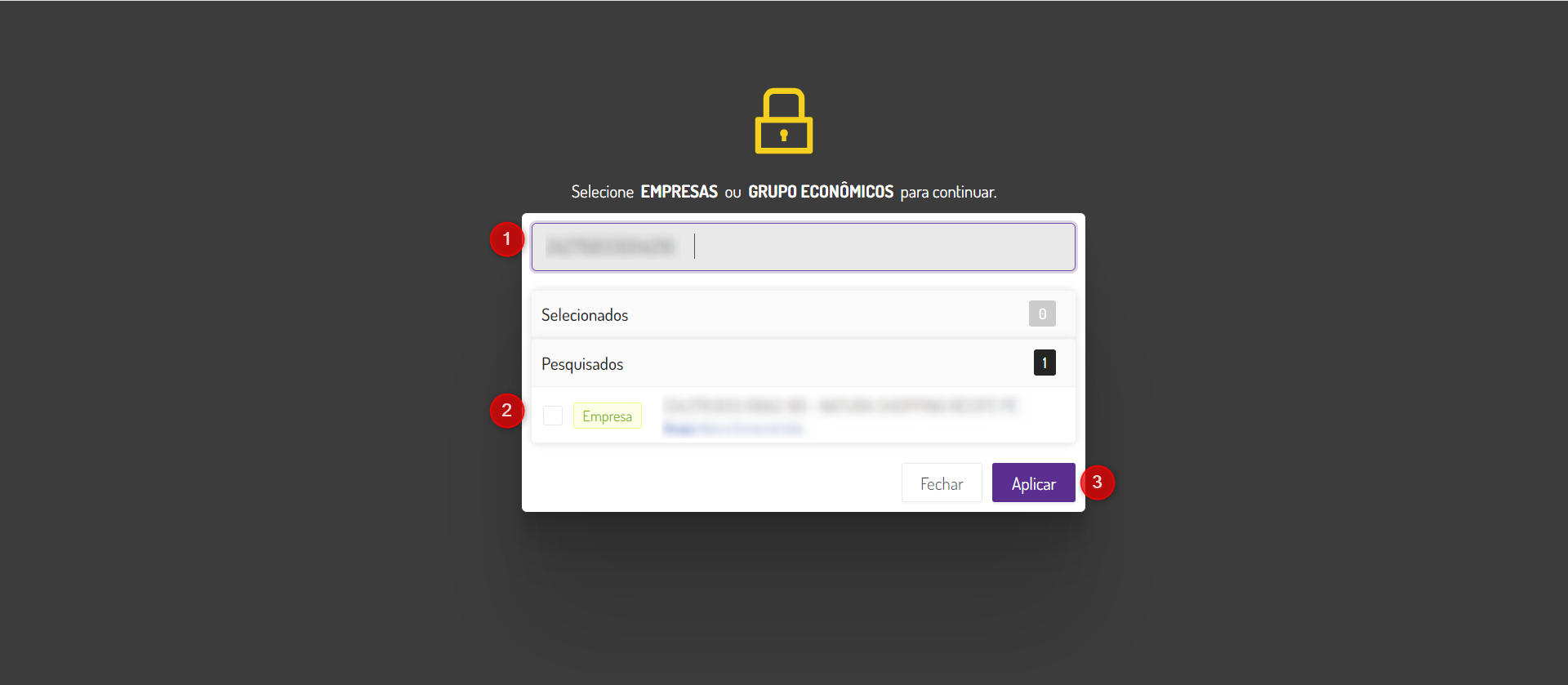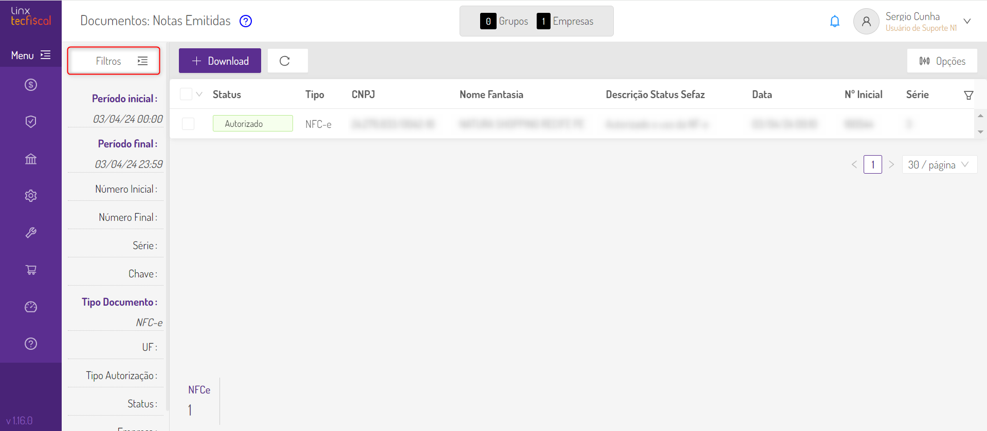 - Informe o CNPJ da loja, marque a loja ou grupo de lojas que precisa realizar o download e clique no botão Aplicar;