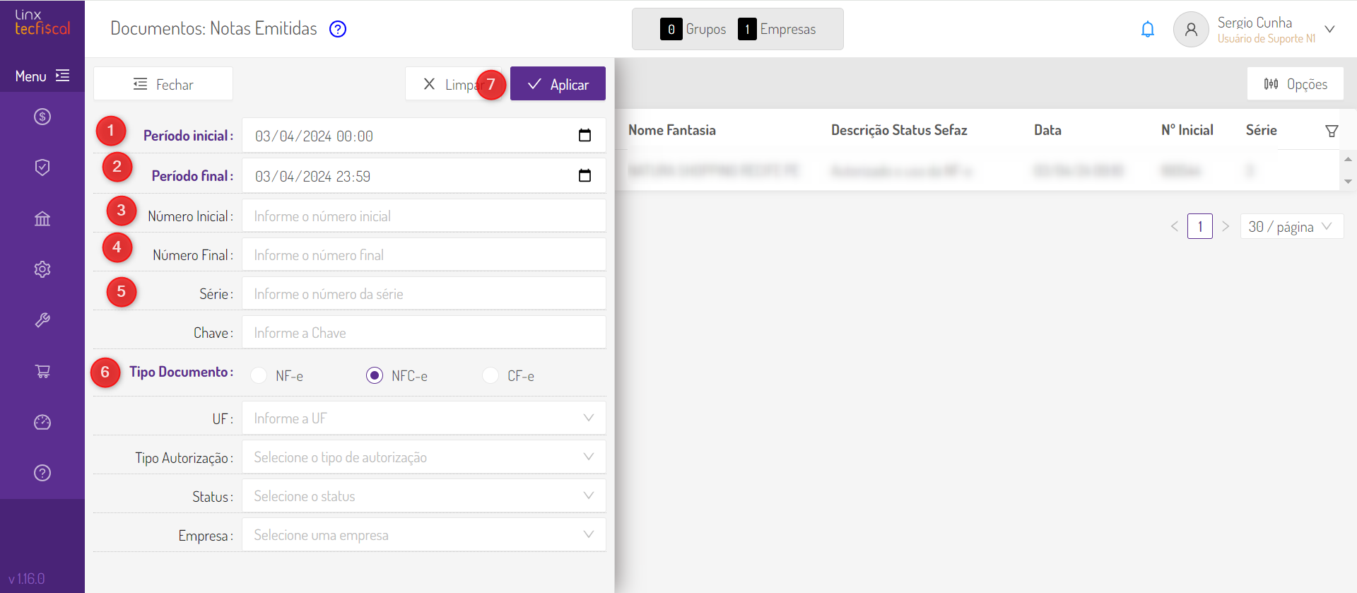 - Informe os campos Período Inicial, Período Final, Número Inicial, Número Final, Série, Tipo Documento e clique no botão Aplicar;