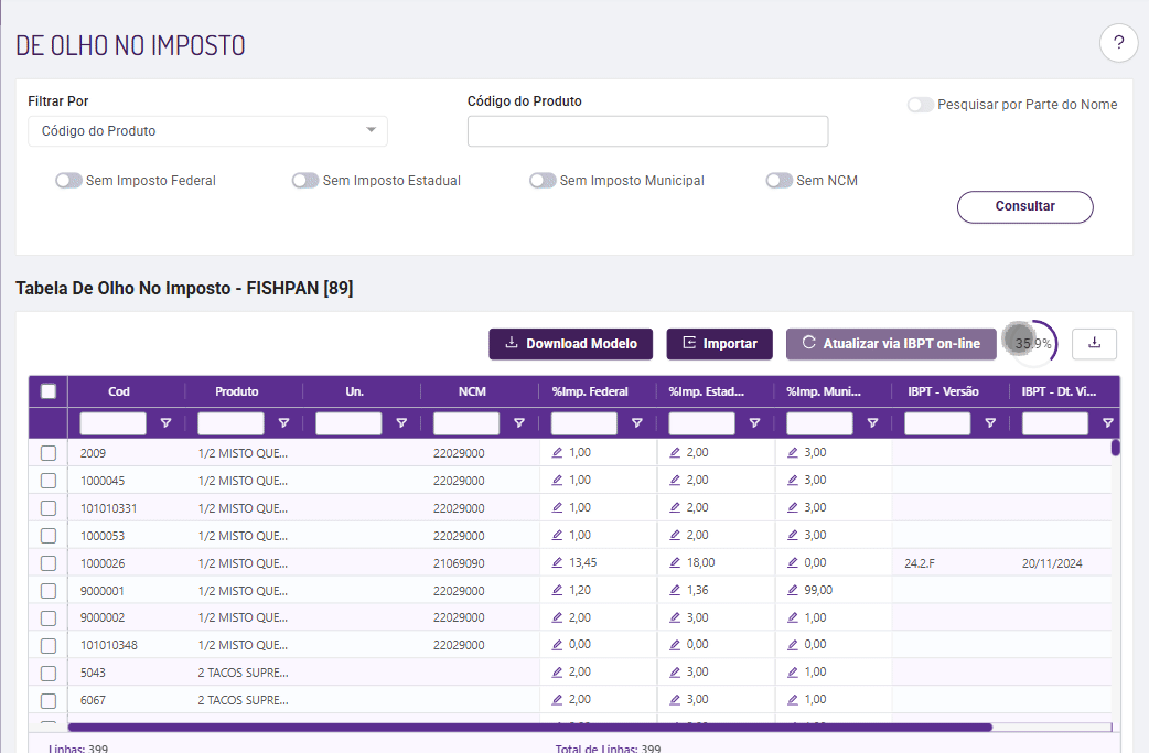 Descrição: A tela passou por melhorias de tecnologia e no processo de atualização via IBPT para que se mantenha mesmo quando o usuário entrar e sair da tela, não será permitido atualizar novamente até que esteja concluído o processo.