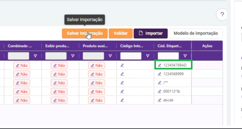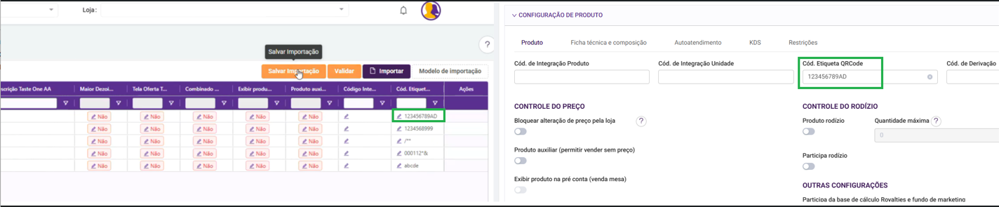 | FOOD-42998 | Importação de Produtos de venda | MELHORIA | Descrição: Permitir que a tela de Importação de cadastro de Produto de venda realize cadastros contento o campo de "Cód. Etiqueta QRCode" |