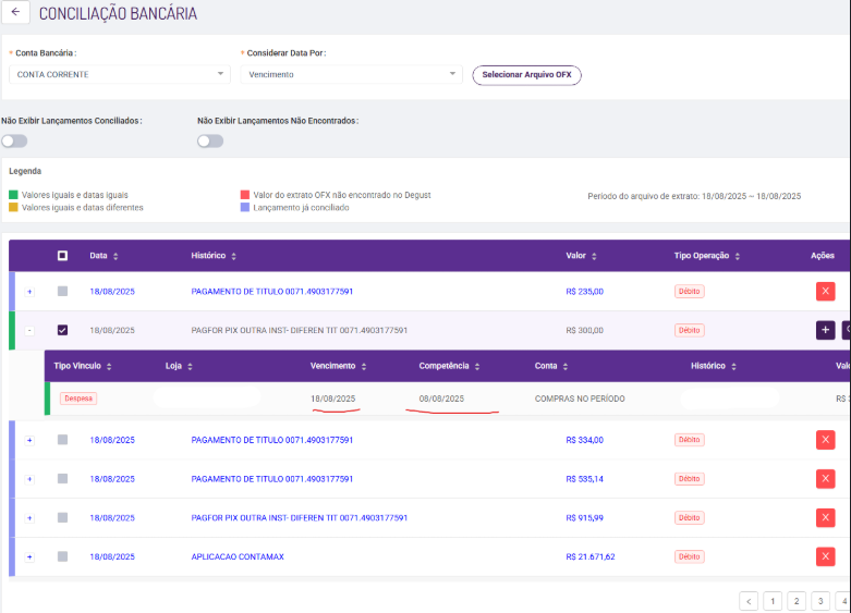 | FOOD-42137 | Conciliação Bancaria Arquivo OFX | CORREÇÃO | Descrição: A demanda teve como objetivo corrigir a data de vencimento exibida em tela durante a importação de arquivos OFX.O sistema realizava a busca no banco de dados apenas com base no valor total do lançamento. Ao encontrar o primeiro registro correspondente, utilizava a data de vencimento daquele registro, o que ocasionava divergência entre a data real do título e a exibida no sistema — especialmente em casos com valores repetidos. |